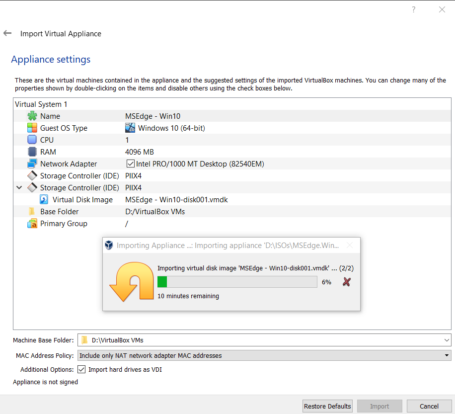 Finalize the VM settings, click Import and go make yourself a snack, popcorn is great, to balance the 2 drinks you had earlier. This process can easily take 10+ minutes.